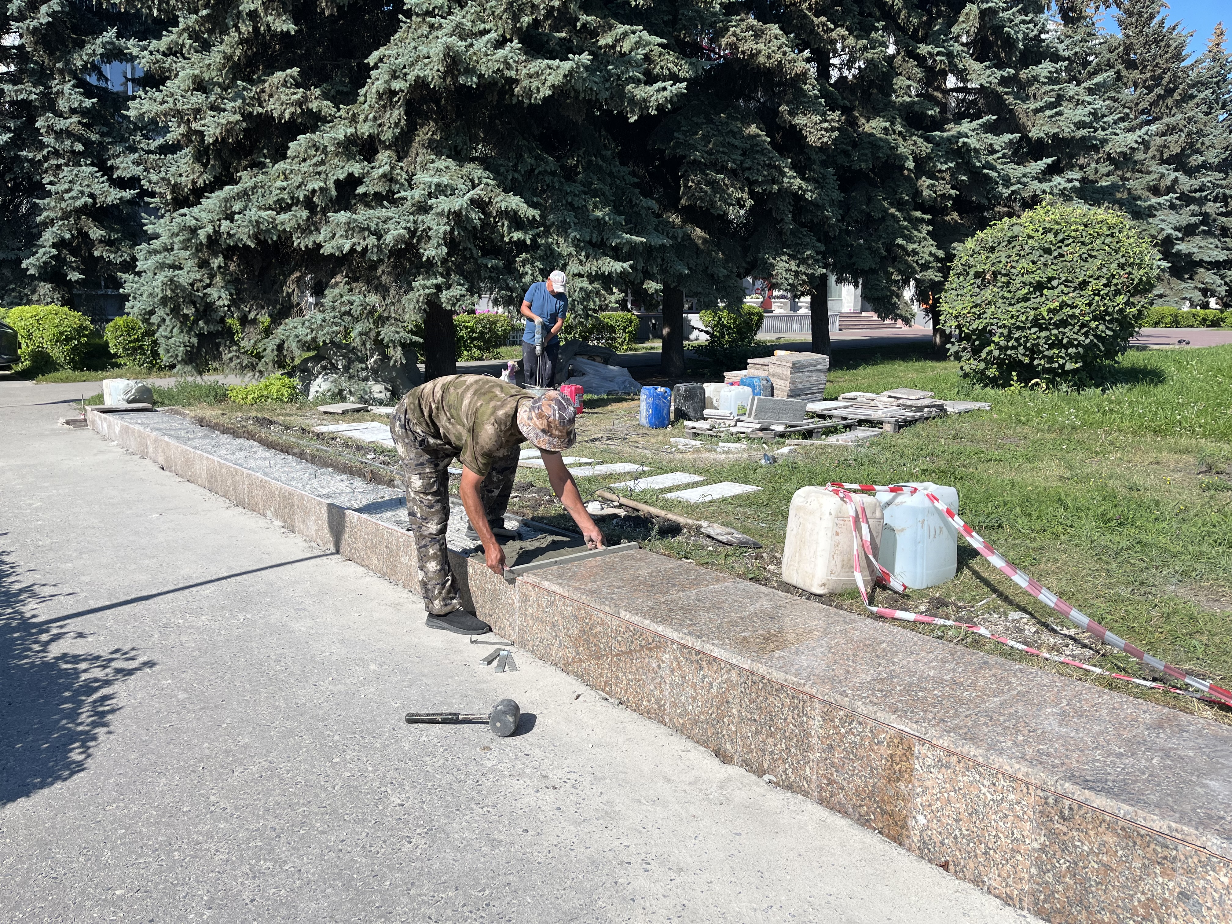 На центральной площади города подрядной организацией продолжаются работы по укладке плитки. Параллельно восстанавливается облицовка парапета, который нуждался в реставрации. Проводится его выравнивание и укладка нового плиточного