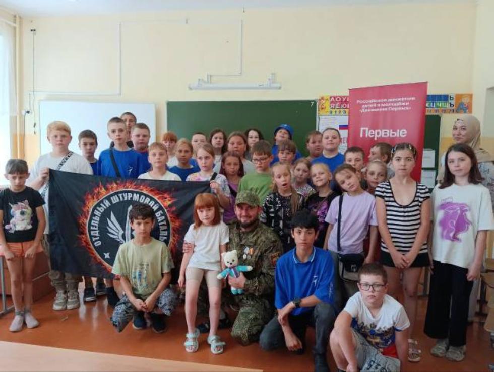 В четверг, 24 июля, в целях гражданско-патриотического воспитания, в школе с. Пионер состоялась встреча воспитанников детского оздоровительного лагеря Ромашка с участником специальной военной операции Авазовым Авазбеком Адиловичем.